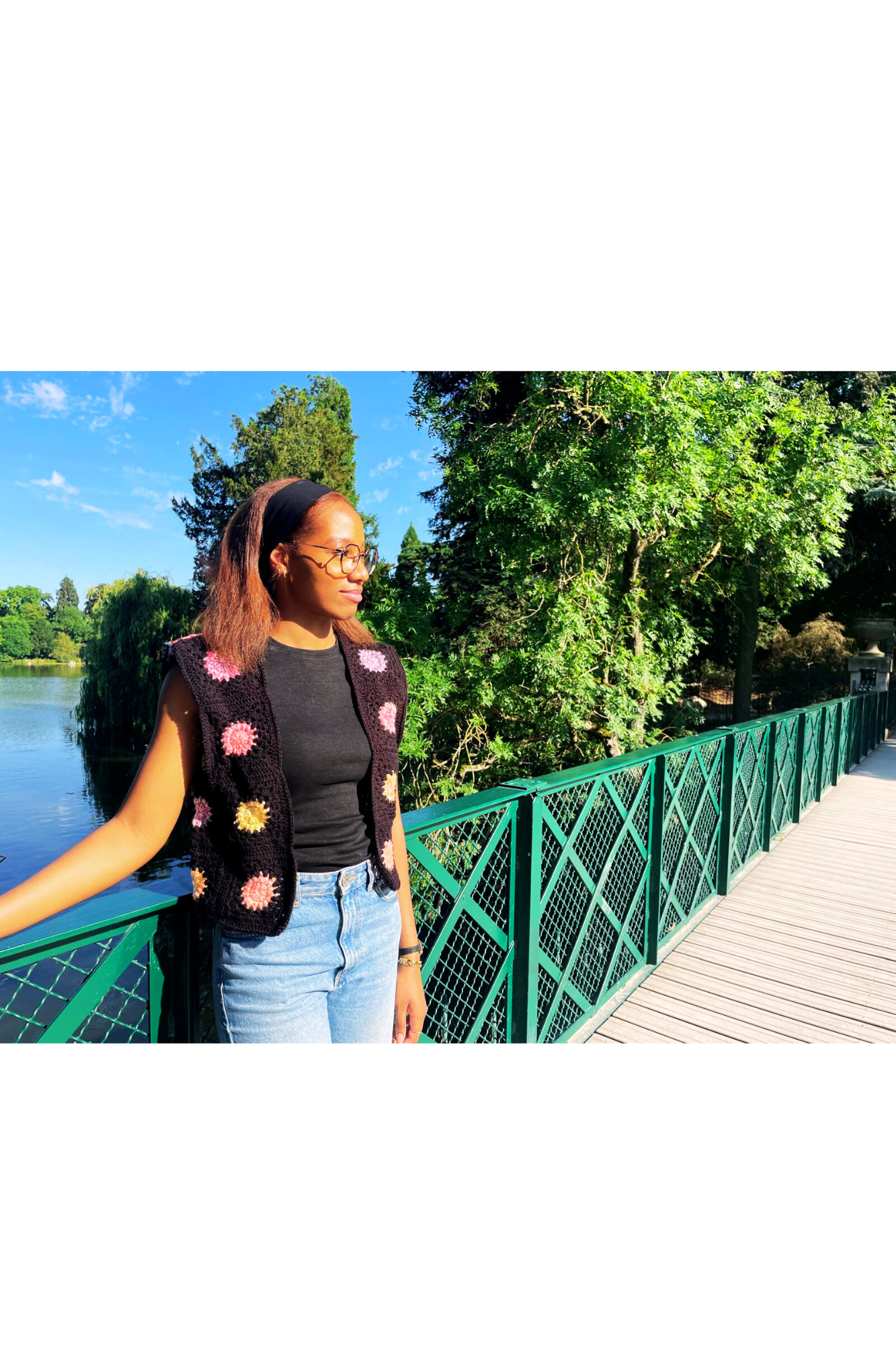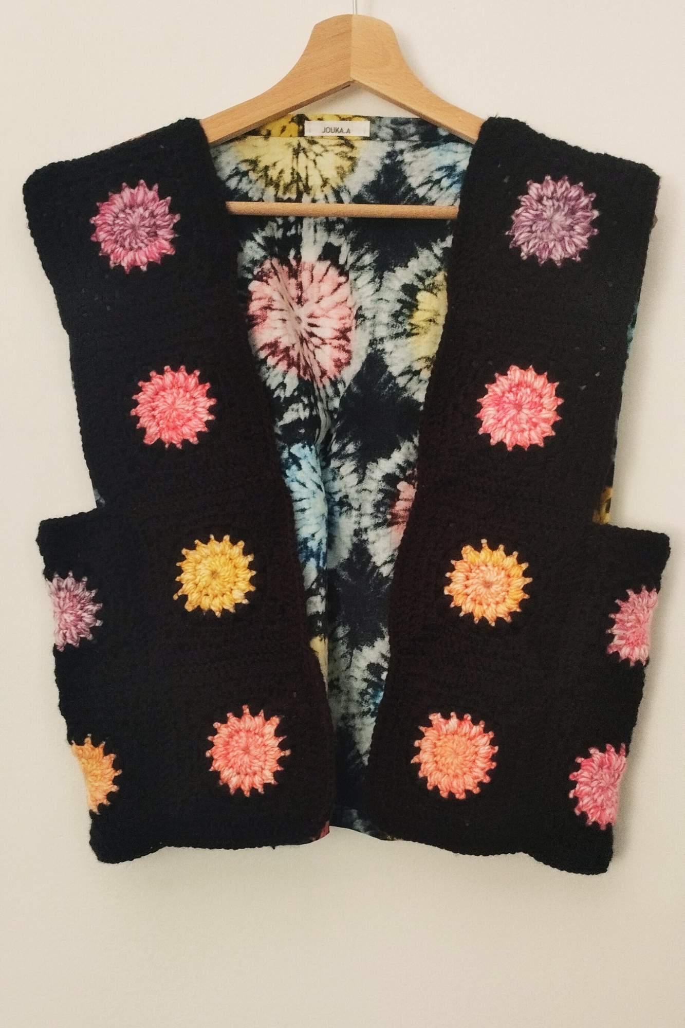 Plongez dans l’univers vibrant de la création artisanale avec cette veste sans manches unique, signée JOUKA.A. Mélange audacieux entre un tissu tie and dye multicolore et un crochet noir orné de soleils colorés, elle incarne un style libre, solaire et engagé.