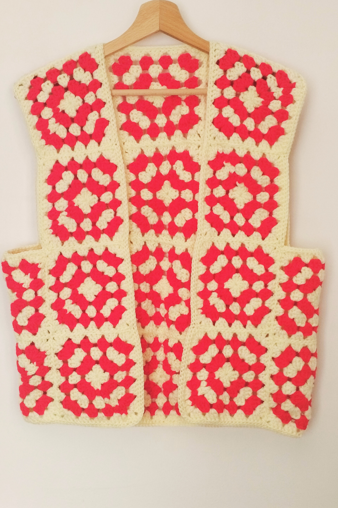 Pour un look bohème, chic ou rétro assumé, faites sensation avec cette veste sans manches crochetée à la main, composée de magnifiques granny squares blanc et rouge. Une pièce forte, pleine de caractère, qui mixe vintage, tendance et fait main.